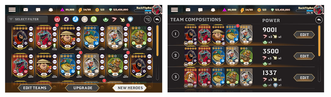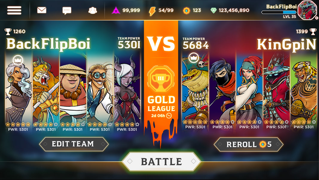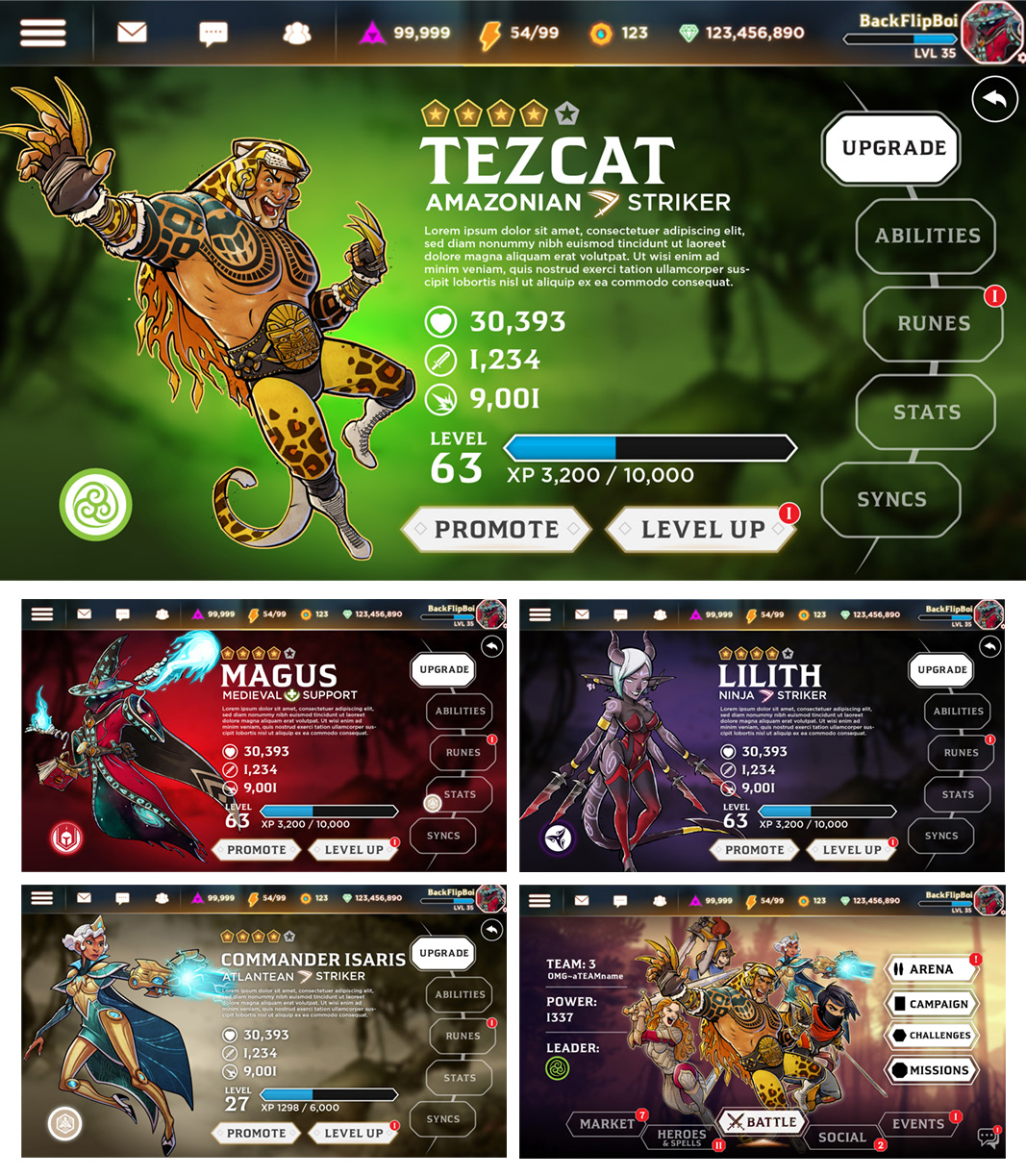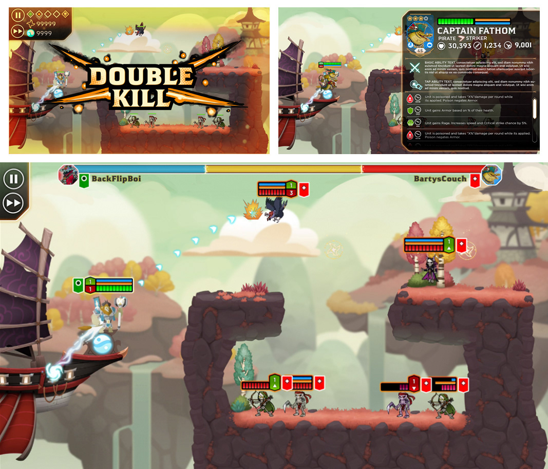 Unreleased mobile hero-battler game title. Working with the PM and the art lead, I oversaw UX, created the UI style/elements and contributed a few character designs to the game.